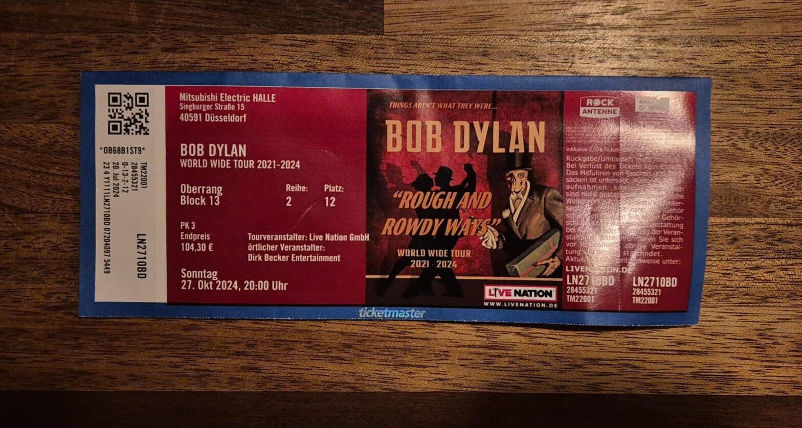Zo kwam het dat ik twee dagen later samen met Theo naar Duitsland ging. Op naar Robert Allen Zimmerman. De laatste jaren is Dylan al een paar jaren aan het toeren met het materiaal van zijn laatste (waanzinnig goede) album Rough And Rowdy Ways uit 2020. Twee jaar geleden was hij nog twee dagen achtereen in Amsterdam. Ik wist dat wel, ik haalde alleen geen kaartjes en kreeg achteraf toch spijt. Dit jaar sloeg hij Nederland over, maar speelde hij wel talloze keren in Duitsland. En ineens reed ik zondagmiddag 27 oktober naar Düsseldorf. Naar de Mitsubishi Electric Halle.
